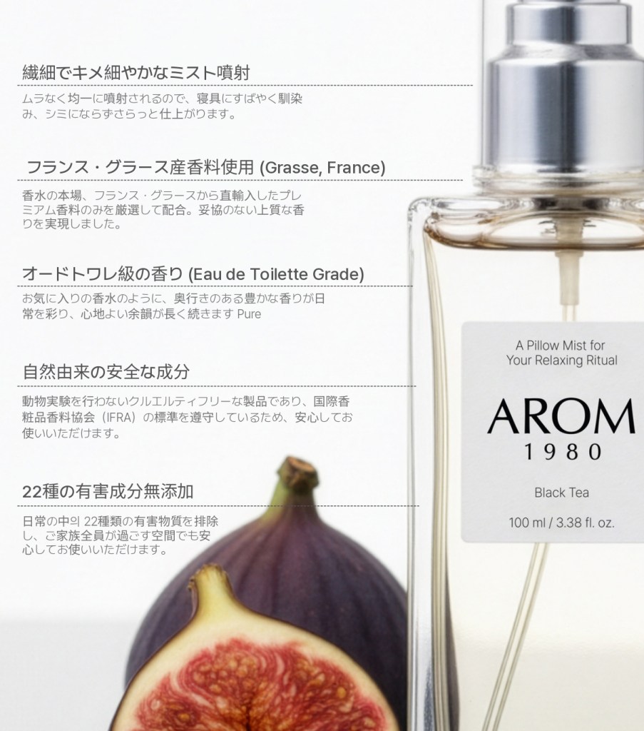 今回の主力製品である「ピローミスト」は、フランス・グラース(Grasse)産の最高級香料を贅沢に使用。オードトワレ級の賦香率により、最大48時間の香り持続を実現した。機能面でも妥協はなく、国際香料協会(IFRA)の基準を遵守し、22種類の有害成分を排除。さらに、生活の中の不快な臭いを99%除去する消臭機能も備え、寝室環境を清潔かつ快適に整える。